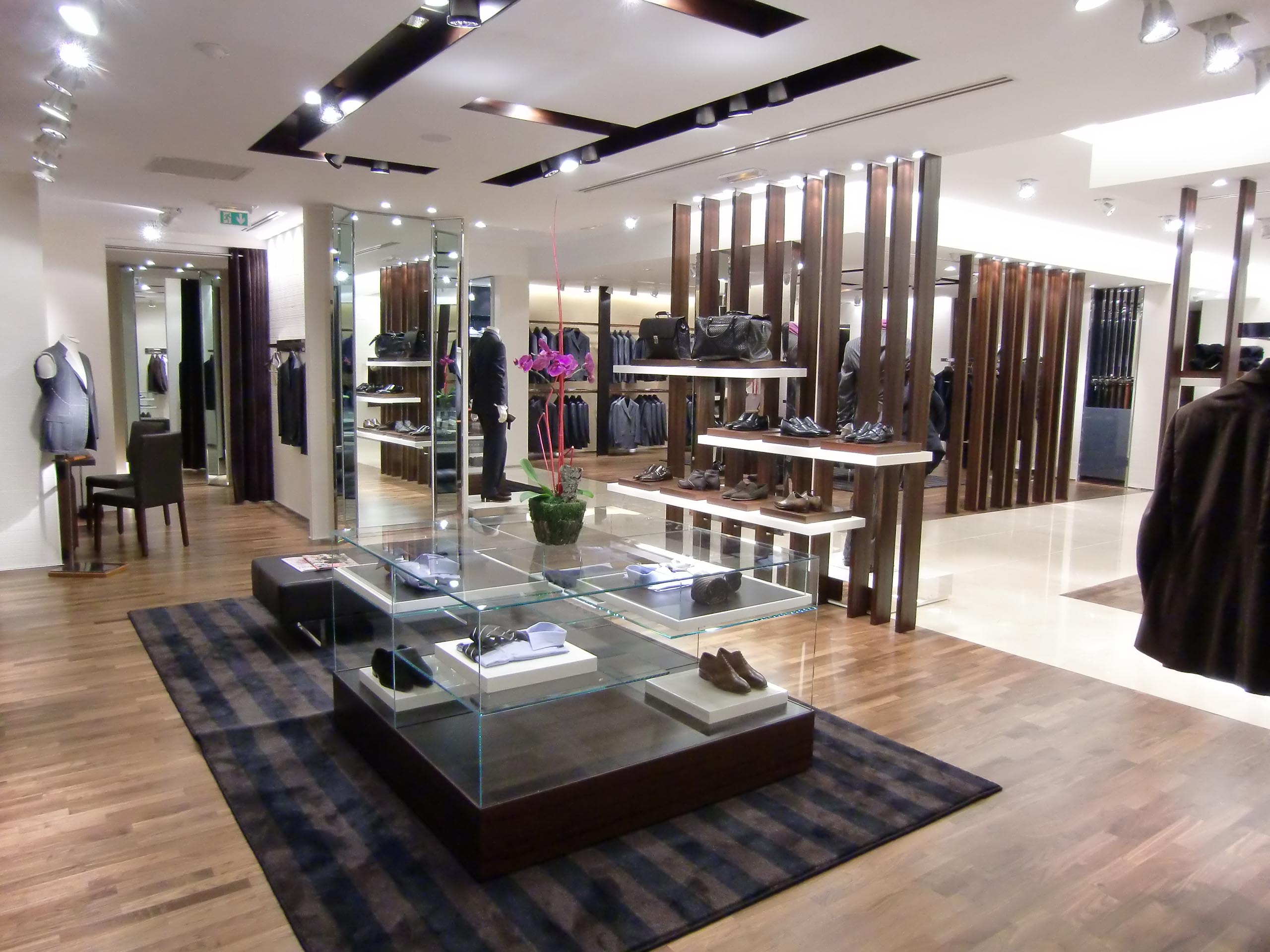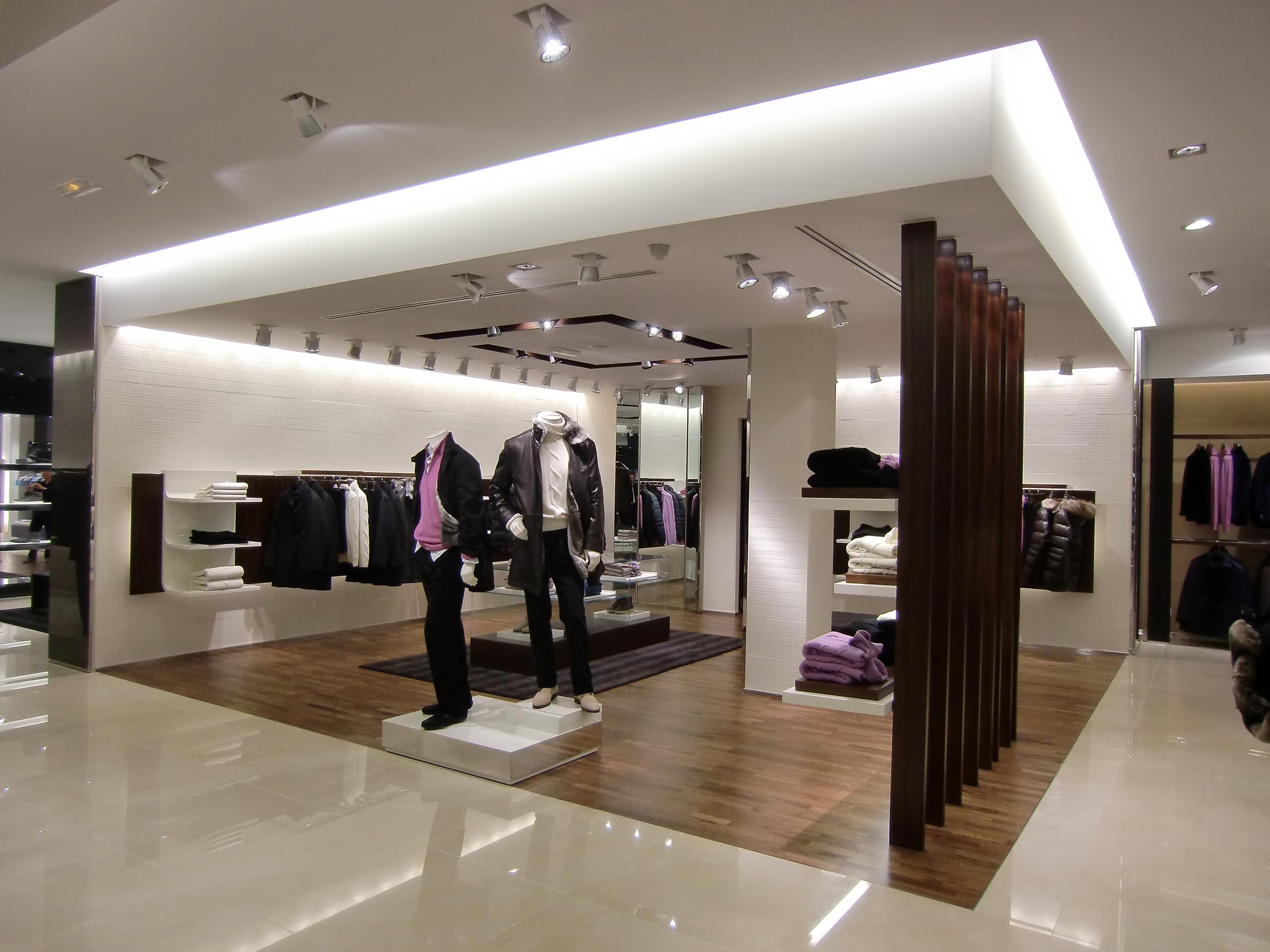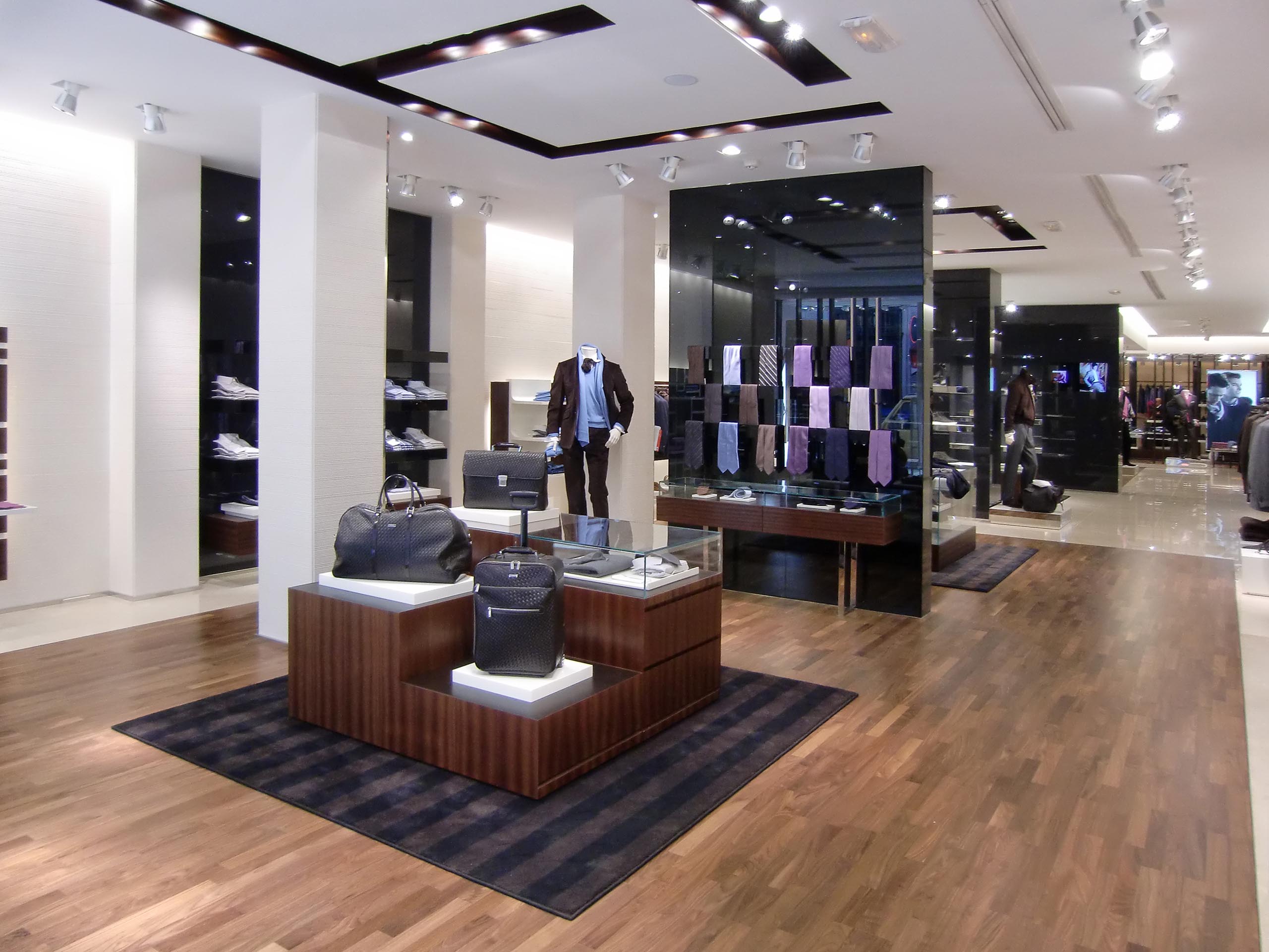 The new boutique reflects the main features of the brand: quality, style, practicality and solidity, expressed by furnishings like the dark leather columns, back-lit by a wall of light to enhance product presentations, and a "Mondrian" style geometrical composition in mahogany or polished steel, with dark crystal or "Marfil a Pettine" stone inserts, created by the cladding on the walls and in the cash desk area, to define the atmosphere as luxurious and welcoming.