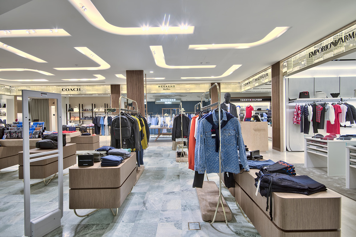 Beveled-edge light coves, custom-made by Flos for this project, illuminate and decorate the ceiling of the central area. The diffused light inside the coves and the adjustable spotlights that come out of it create a perfect balance of ambient light and accent light that makes the displayed goods stand out.
