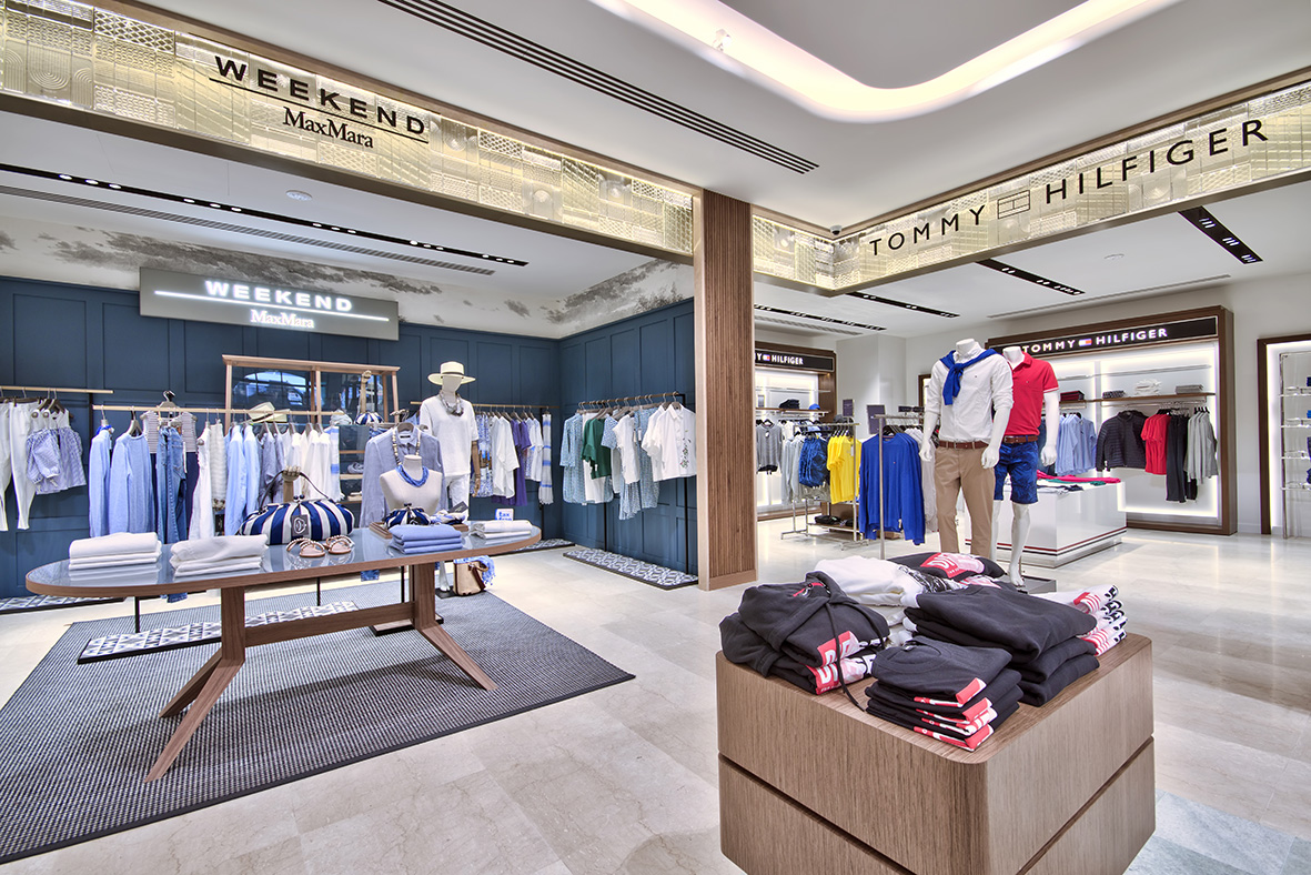 Each brand corner furniture is identified by the single brand’s own interior concept, the central area is equipped with free-standing furniture designed specifically for Saltwater and identified by a Mint green marble floor.
