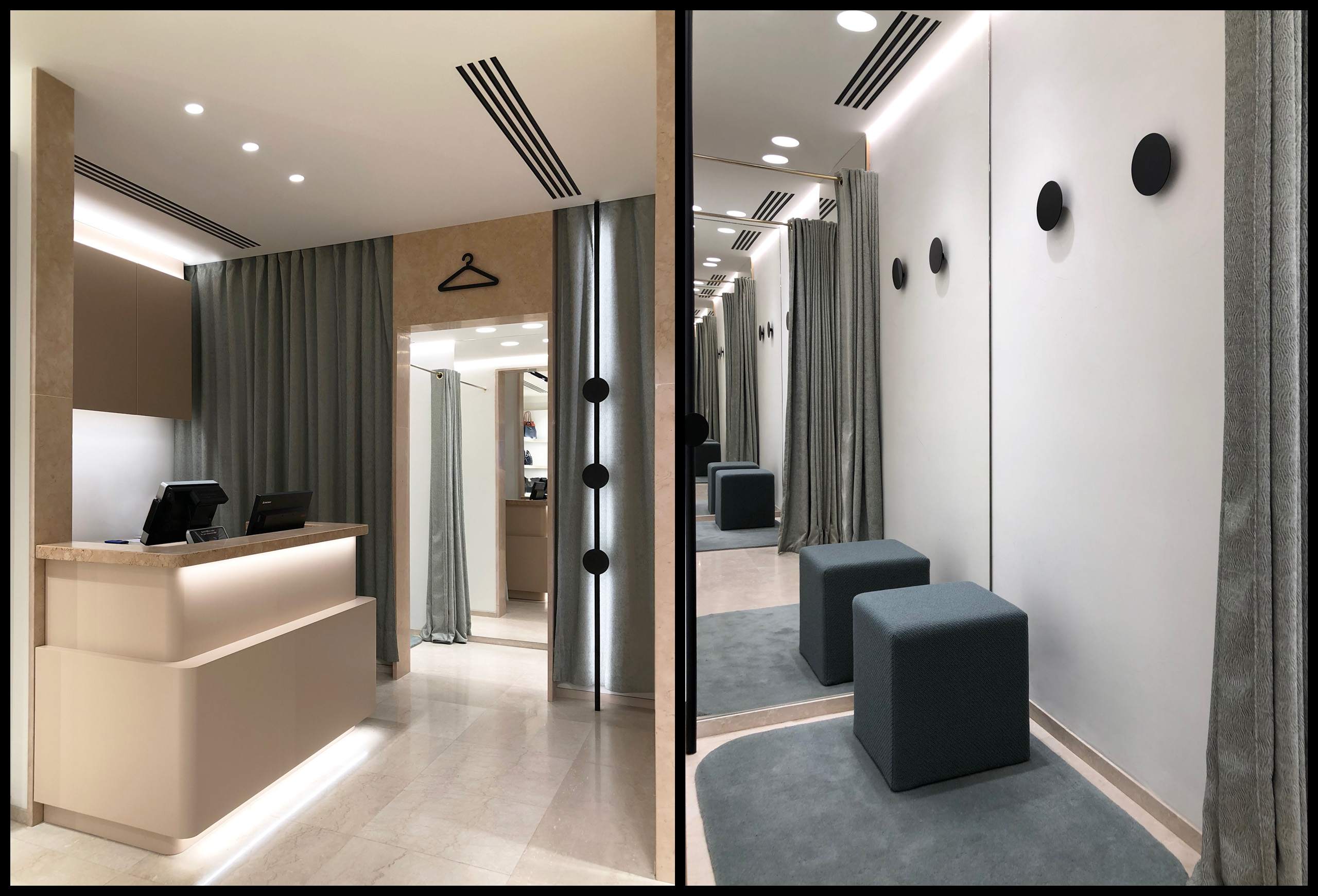 The fitting rooms are hidden behind a rich olive-green curtain, that cover a solid wall, which contrasts with the Rosa Perlino marble access portal. A decorative black metal lamp with three back-illuminated disks, create a welcoming and home environment, so as to put customers at ease who try on clothes.