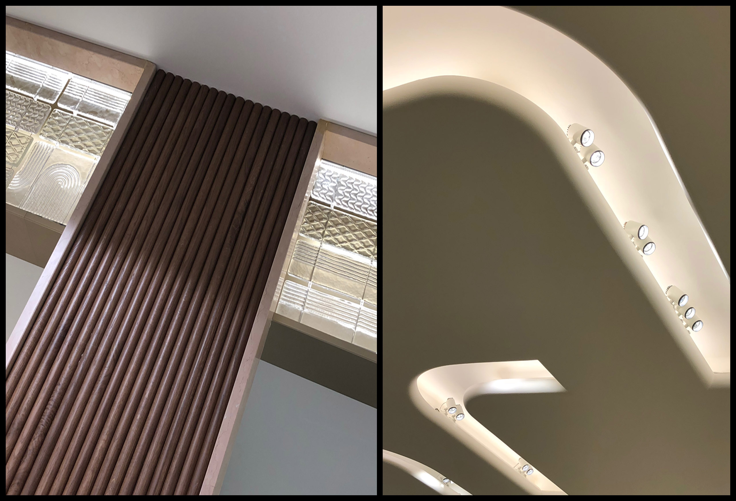This fascia is made by a modular system of suspended LED illuminated textured glass tiles that give an elegant touch, like a shimmering crown.