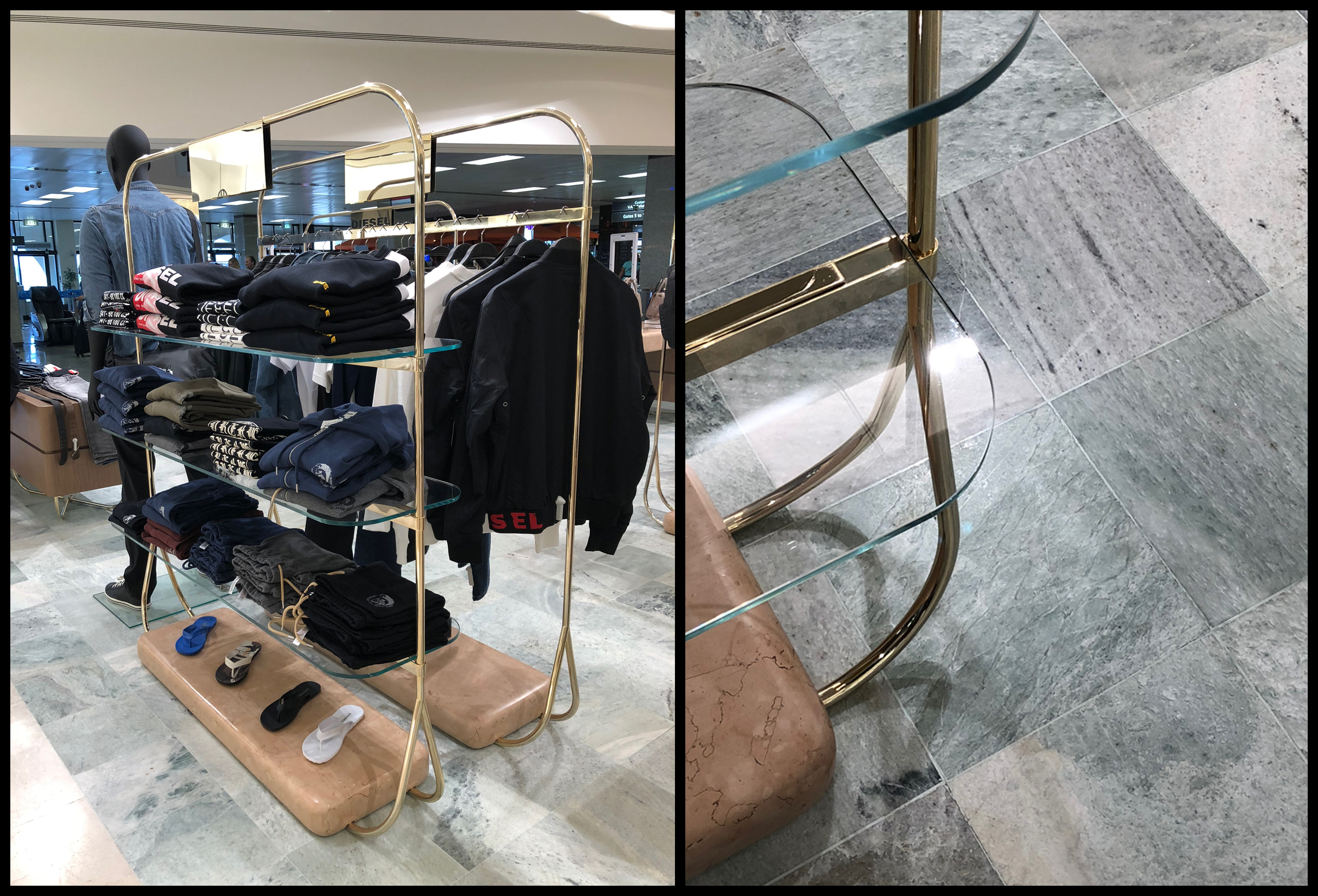 The free-standing hanging display elements include also monolithic stone as a base, from which rises a thin Champagne color polished steel structure that, with its play of reflections, makes the merchandise protagonist.