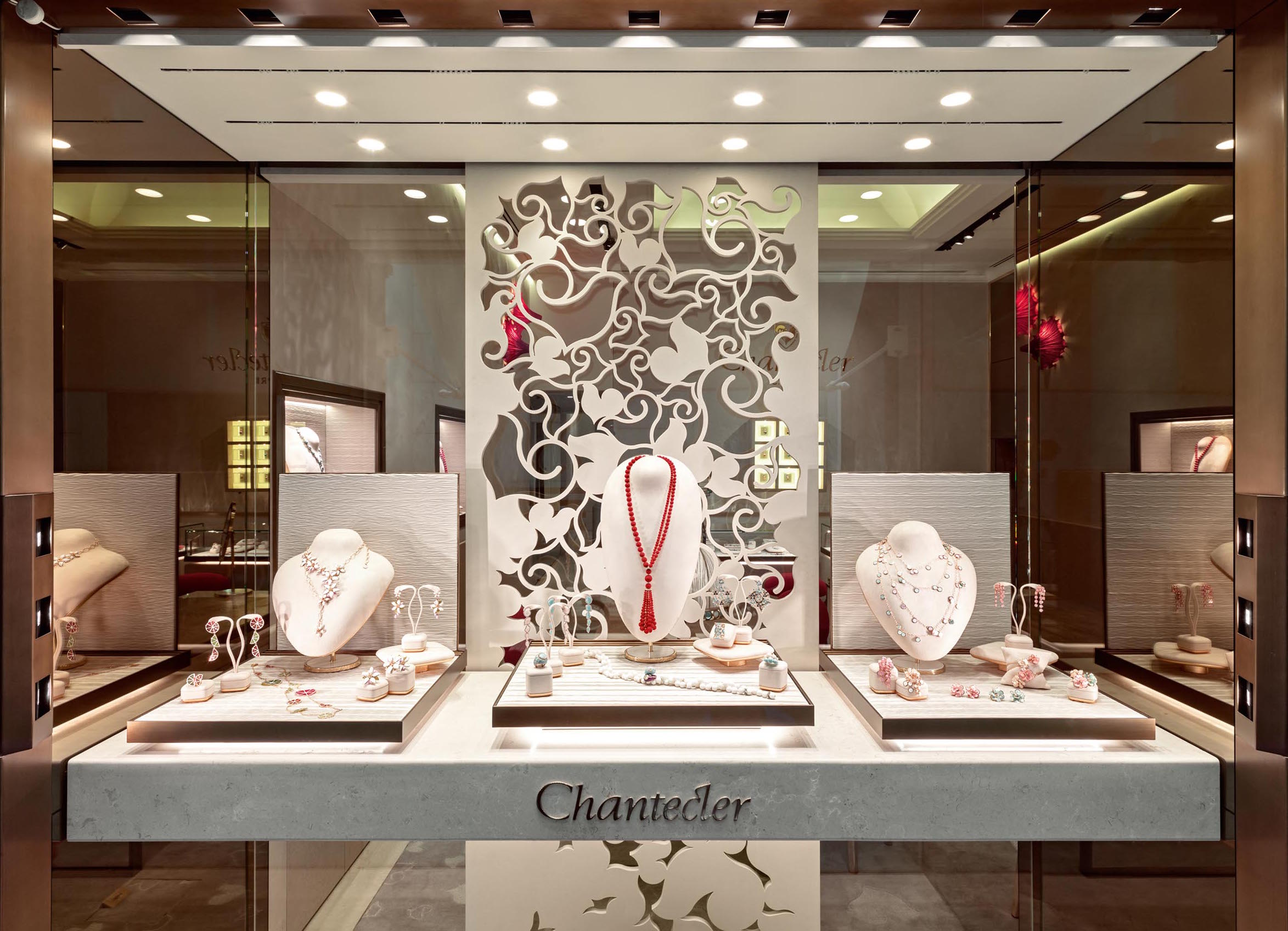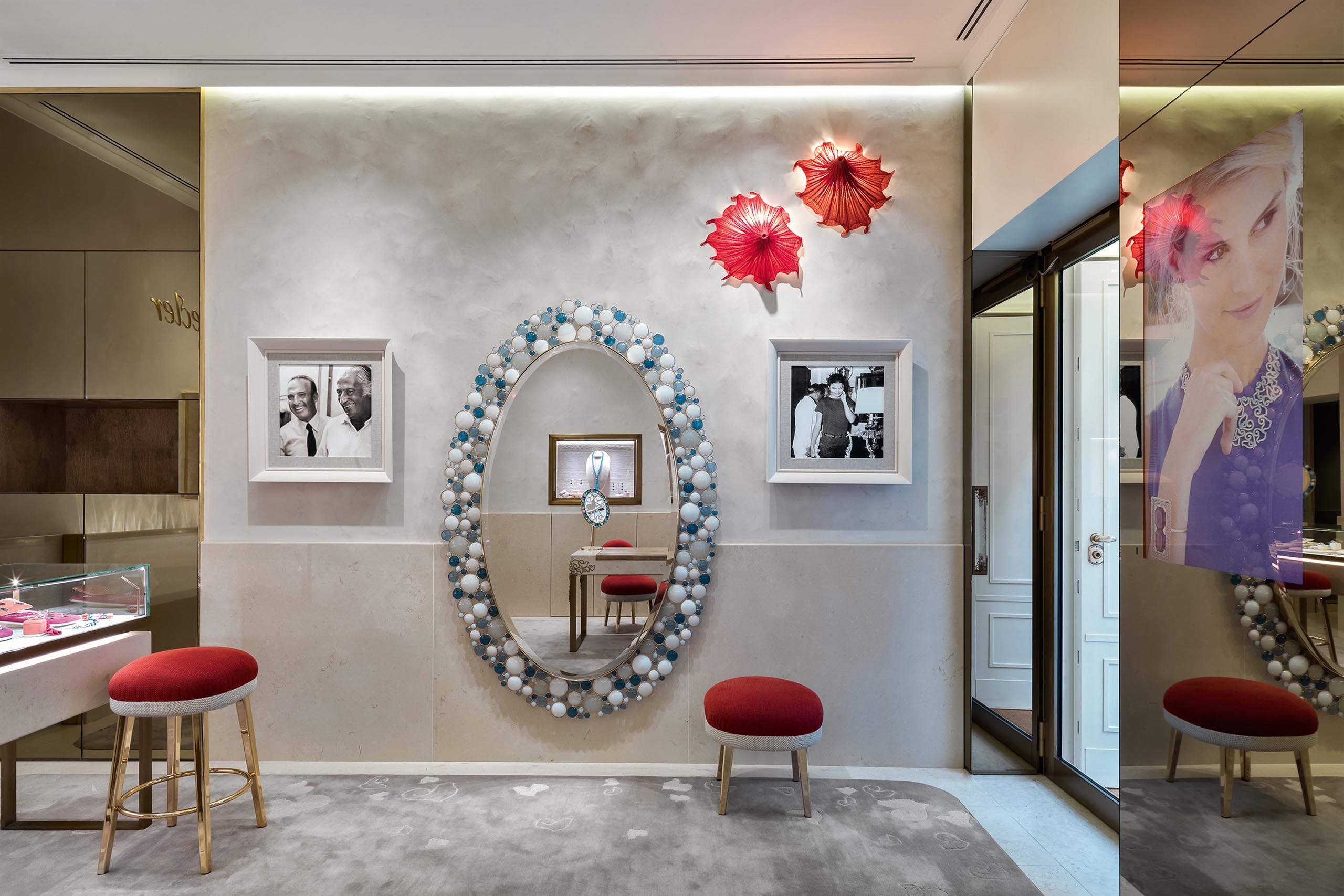 On the front wall, the maison's symbol jewels are framed, museum-like, in a floating display on the stucco wall illuminated by a flowing light of moving water reflections.