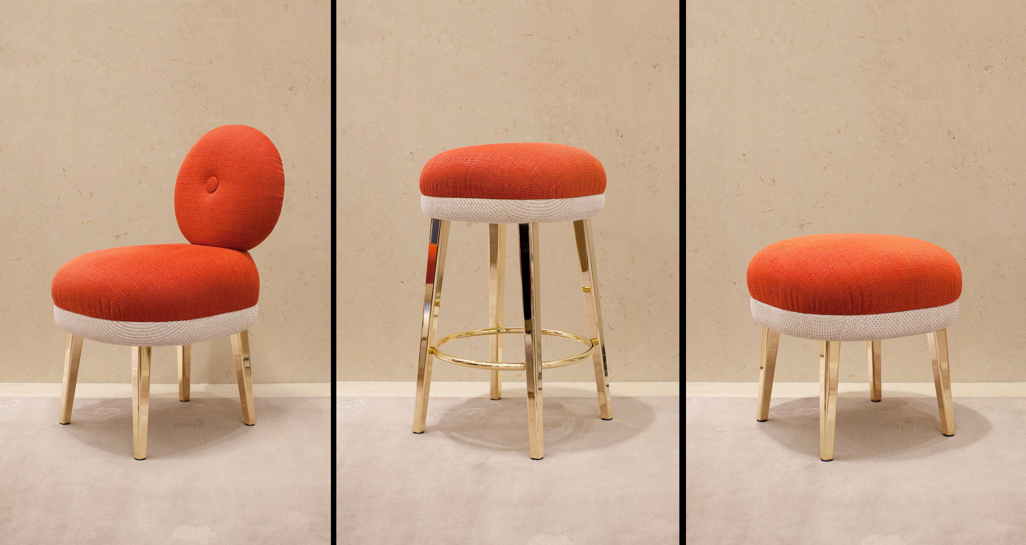 Chair, stool and pouf designed for Chantecler boutiques are made in shiny brass and covered with two different color fabrics reminding coral and sand.