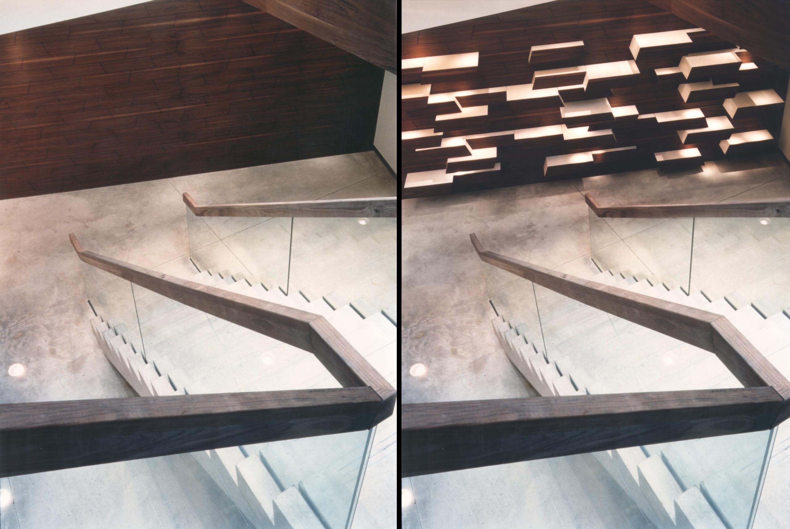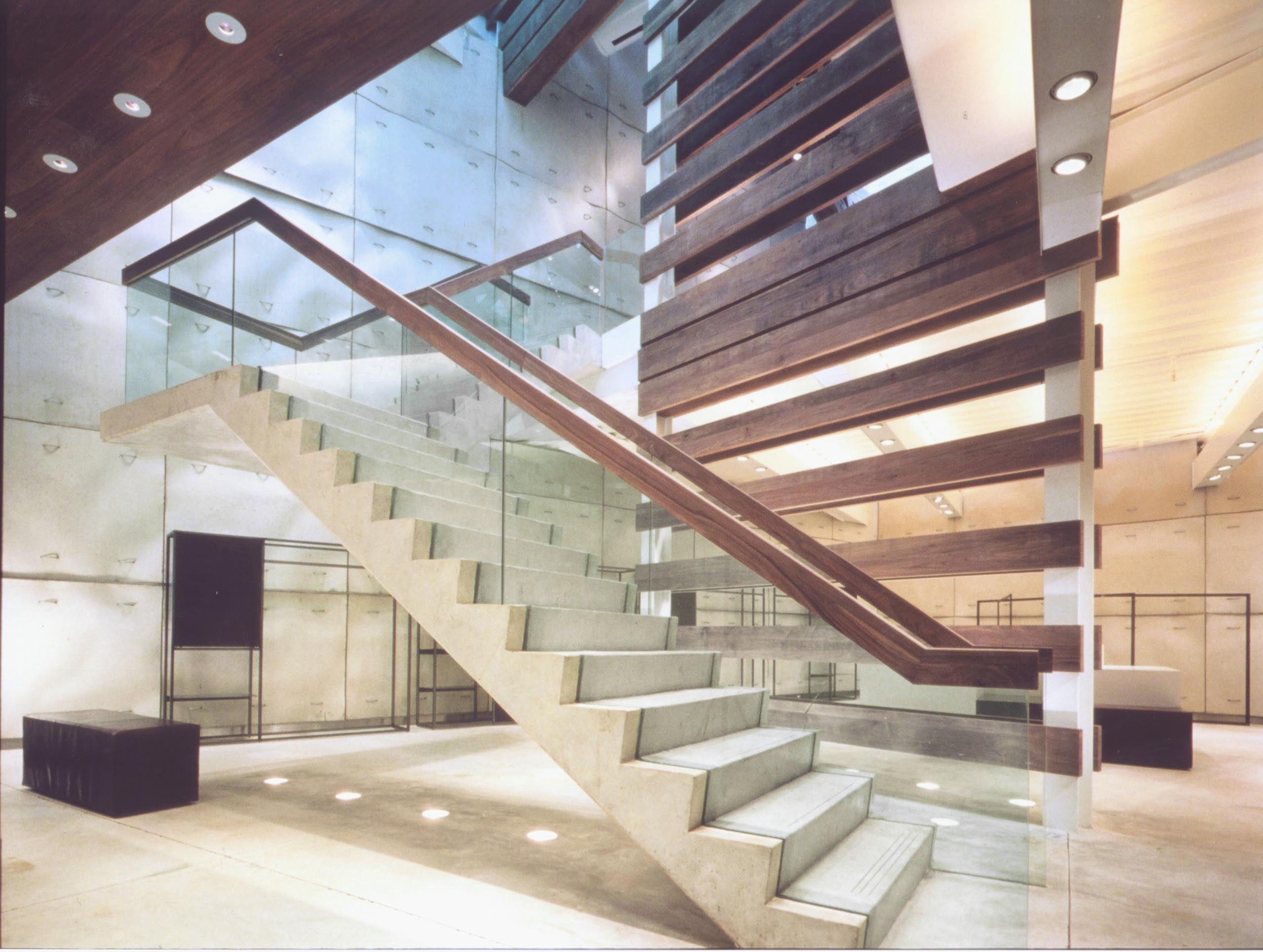 The central atrium is covered up with a flat skylight held up from underneath by white-painted steel beams and perpendicular opaline glass ribs that provide both shade and give structural support to the skylight.