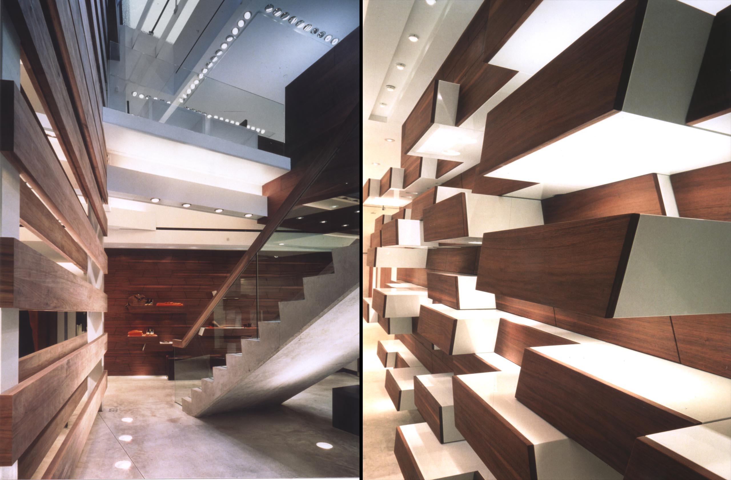 The main forms and planes that give shape to the building are highlighted in walnut wood. Two are vertical planes and two are volumes. One of these two planes is the wood-slat wall that composes the inward-shifted. The second is the so-called "T-wall" which unifies the two retail levels and also creates individual spaces within the shop .