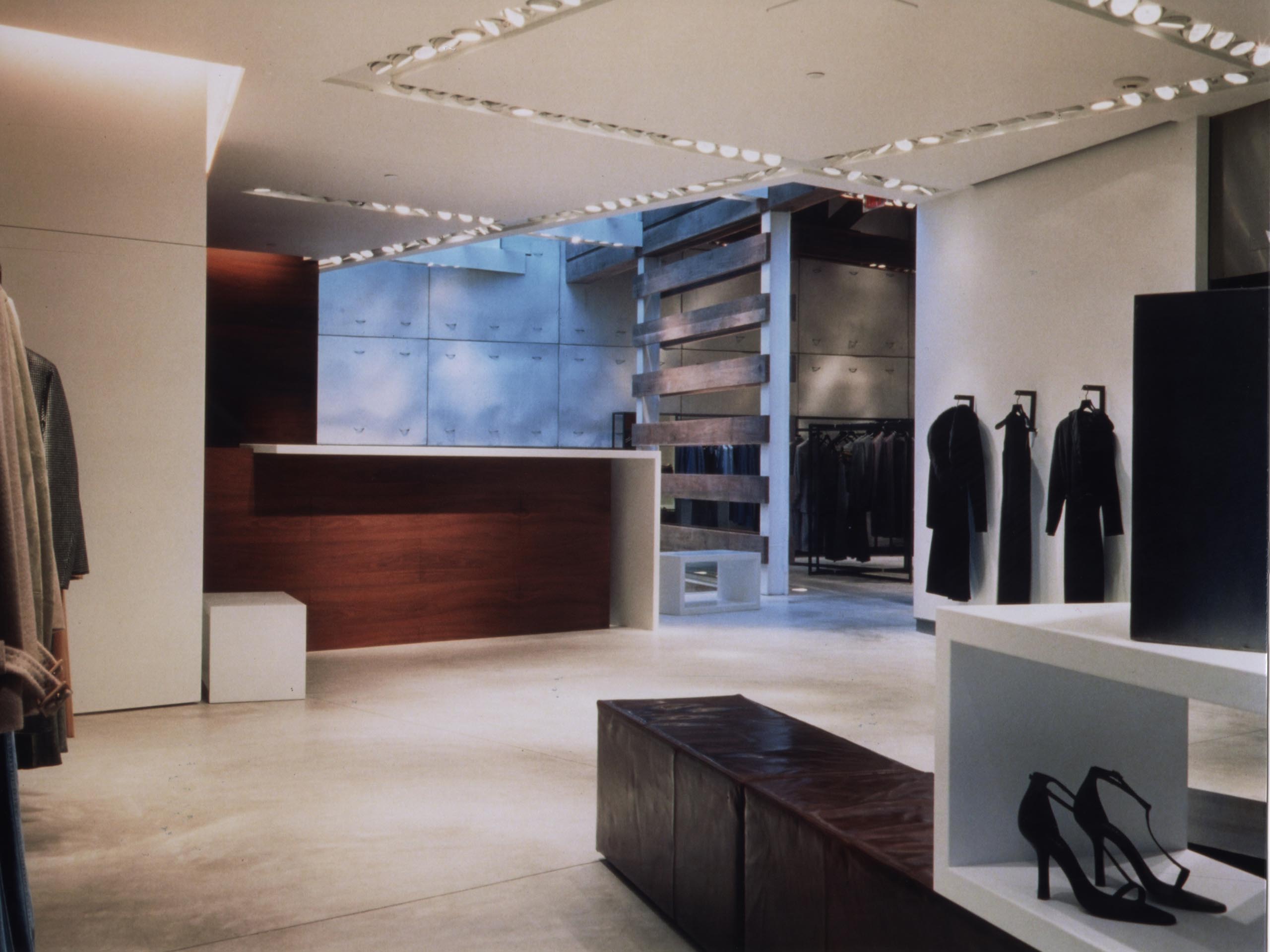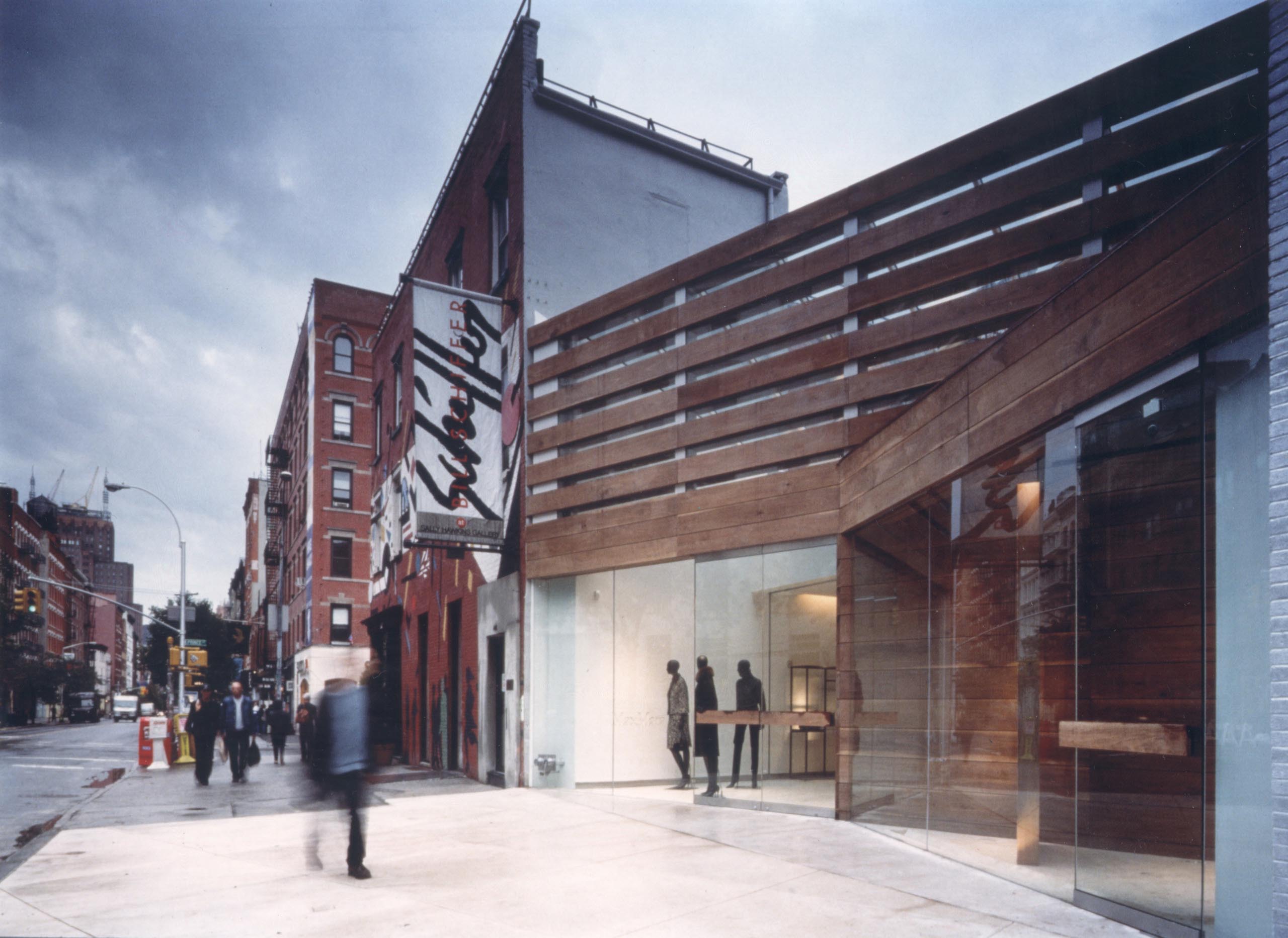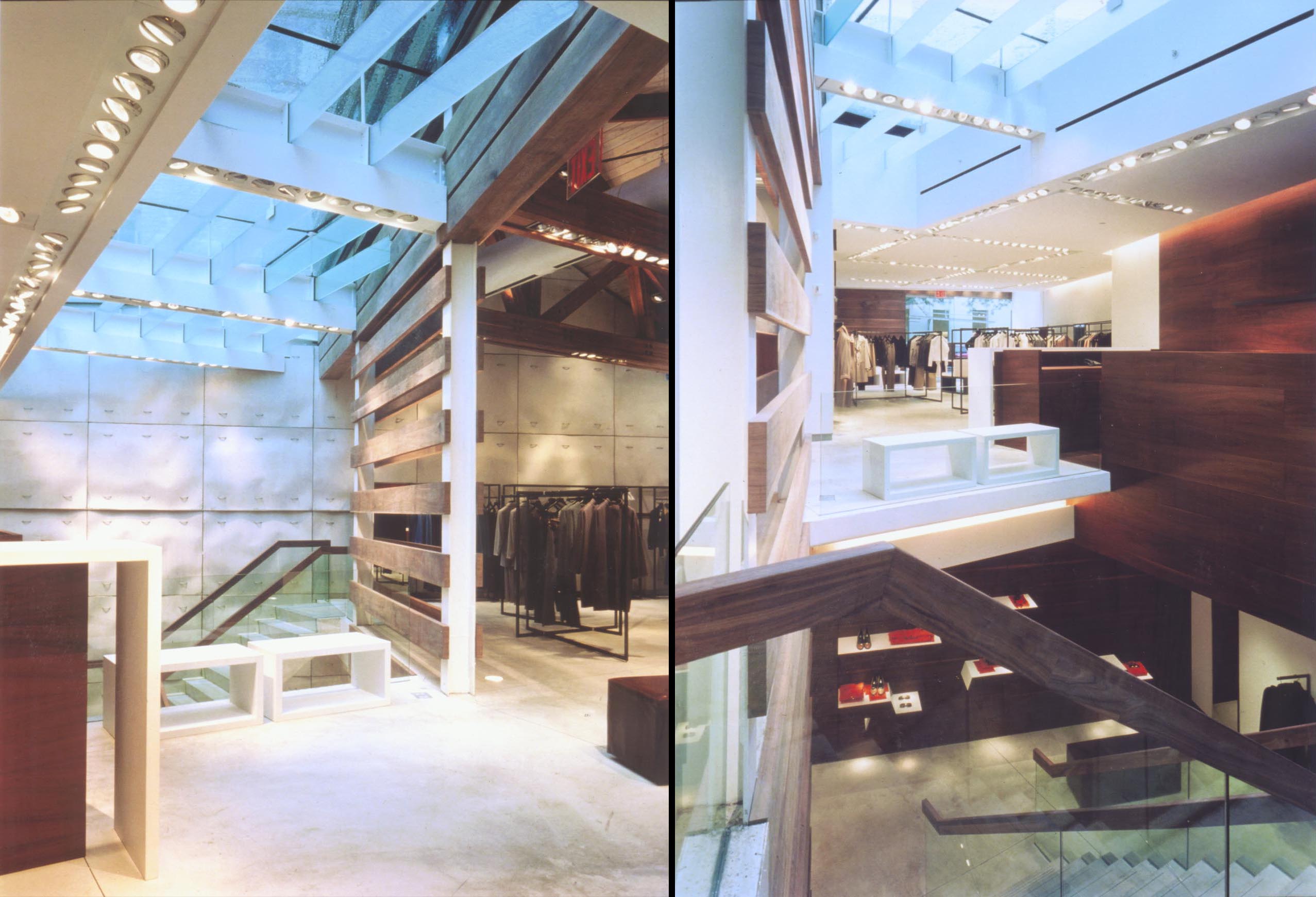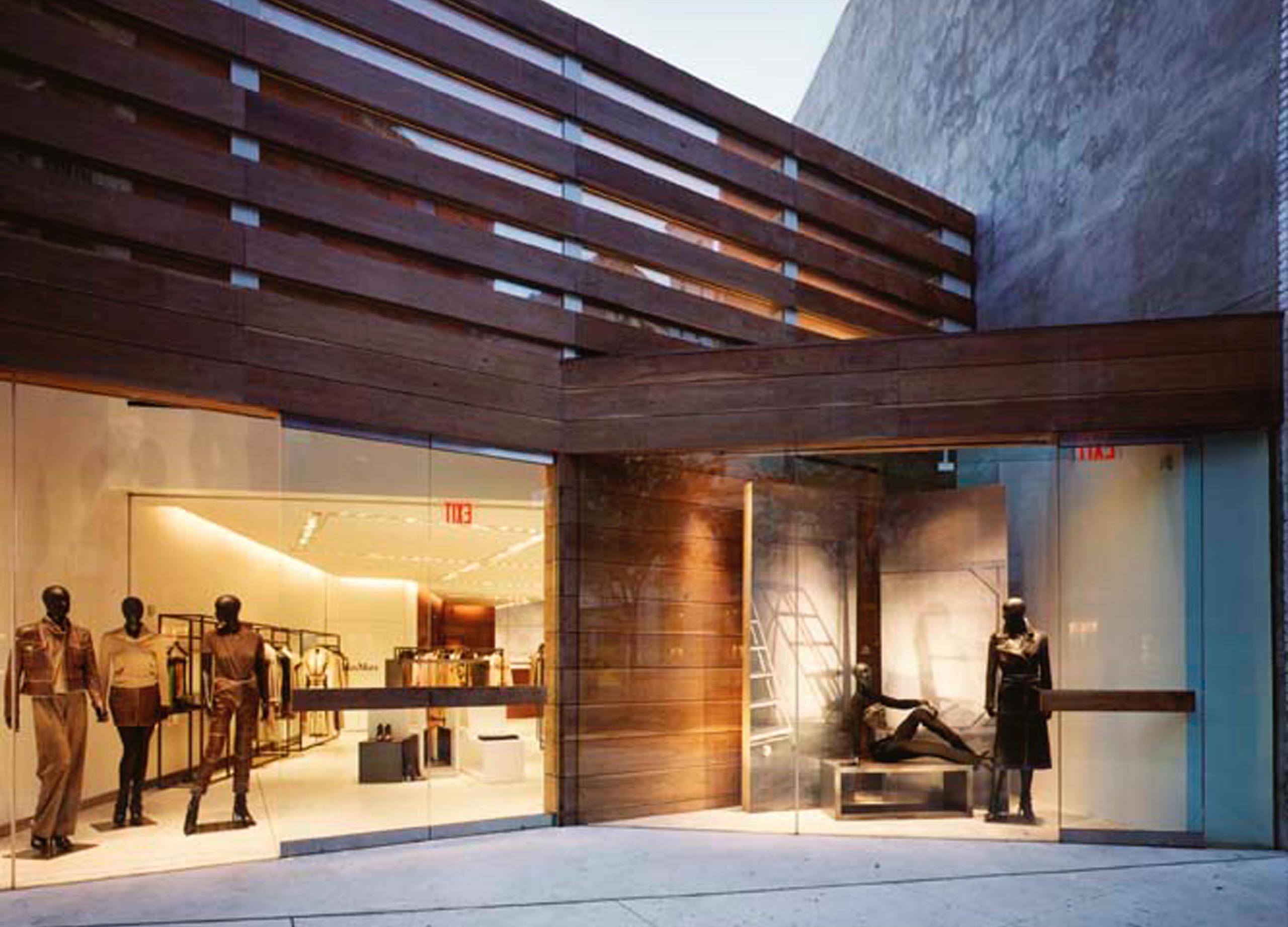 This MaxMara retail shop in New York City is located in SoHo at 450 West Broadway between Houston and Prince Streets. The 6105 sqf (567 sqm) building it consists of two levels of retail space with a main staircase: 3500 sqf (325,20 sqm) for retail space and 872 sqf (81 sqm) for stockroom and service areas.
