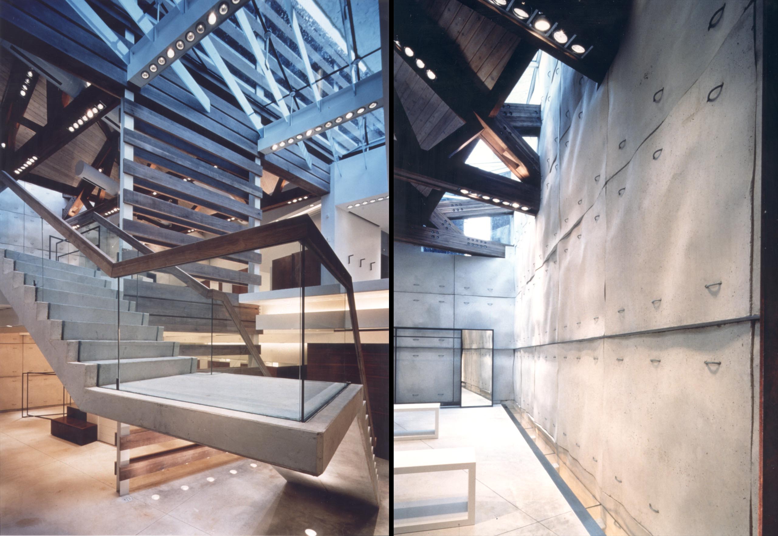 To the north the second retail area is higher and is made up of multiple-sloped triangular cedar roof slabs defined by three laminated walnut wood trusses and covered up with a copper roof in the exterior.