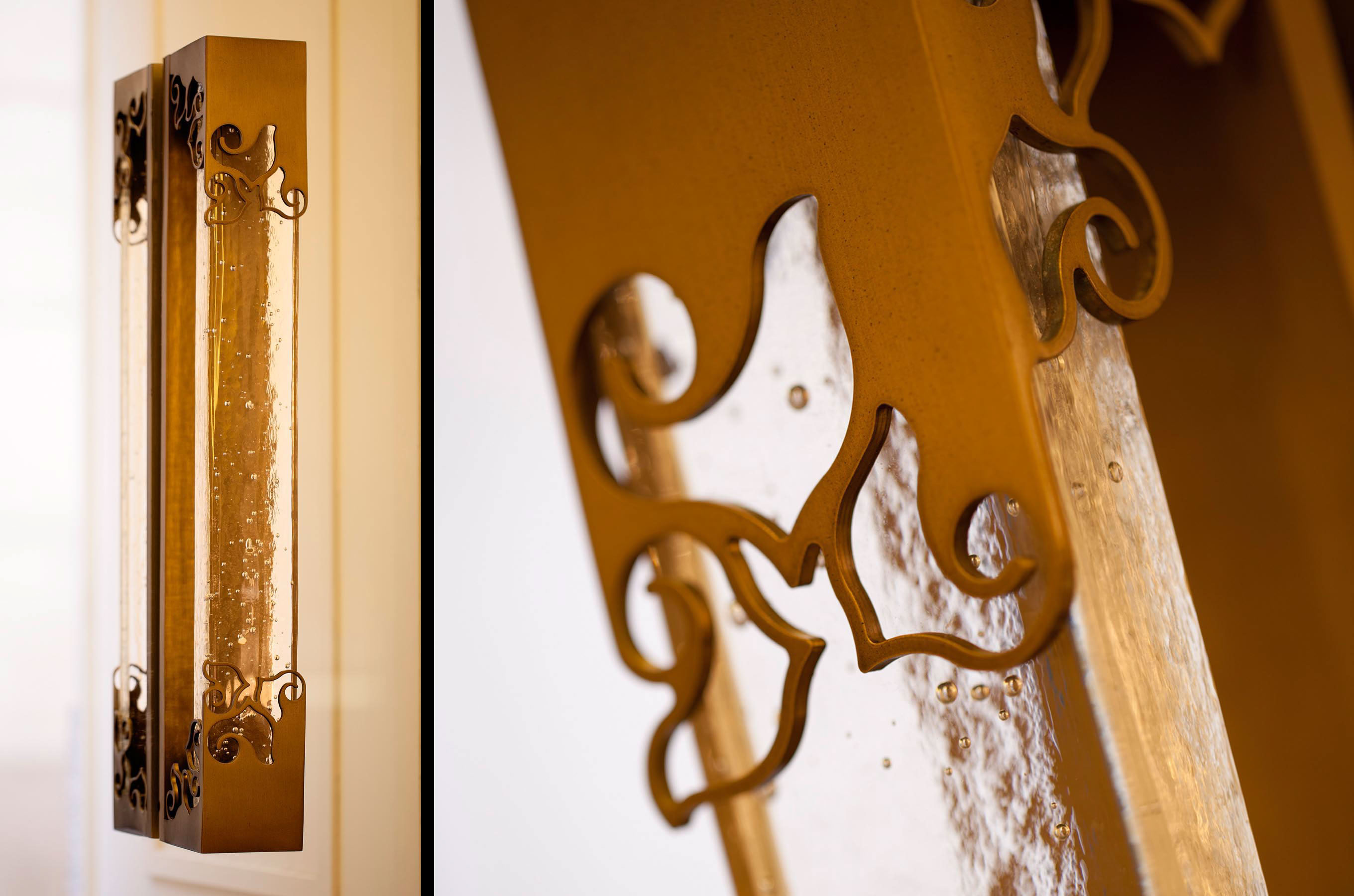 Door handle designed for Chantecler boutiques are made in brass with the typical "rooster" textures and bubbly fused glass to reminds sea water.