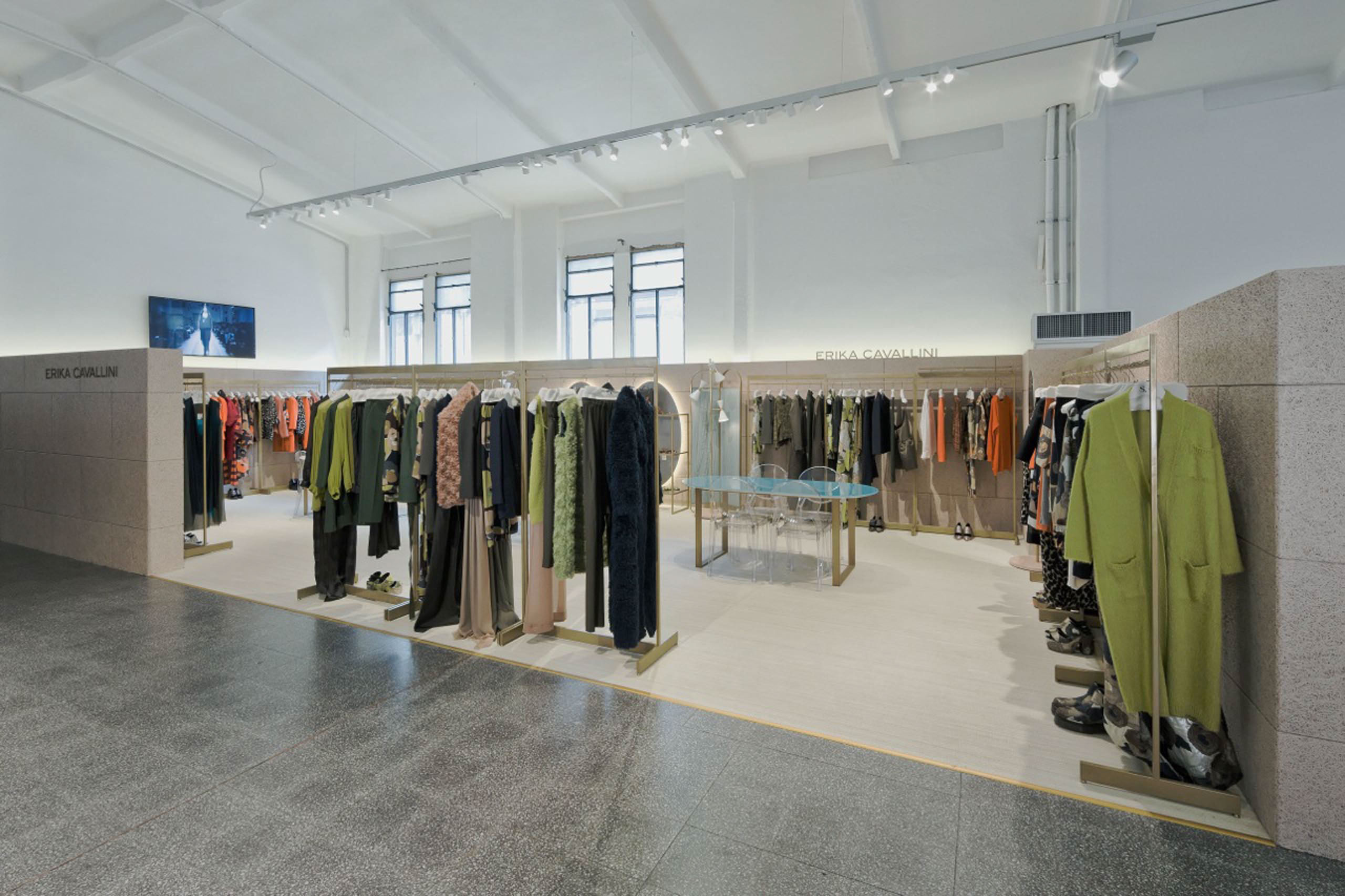 The showroom is developed in a single room with the collections displayed along the perimeter in freestanding metal elements with antique brass finish.