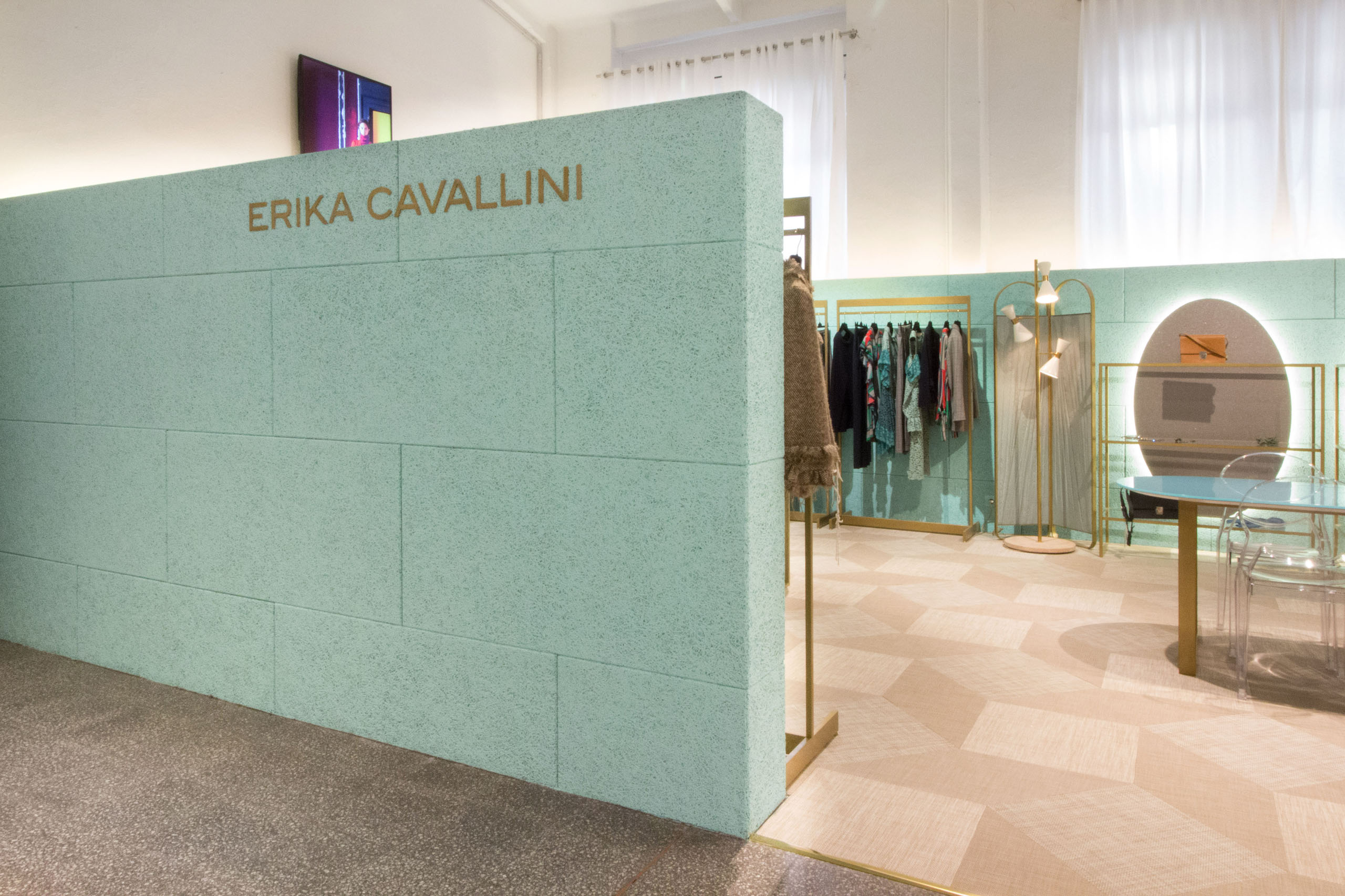 Lighting is emitted along the upper edge of the perimeter walls made in compressed wood-fiber panels coloured sage color, its ashlar composition becomes a vibrant background to the whole collection.