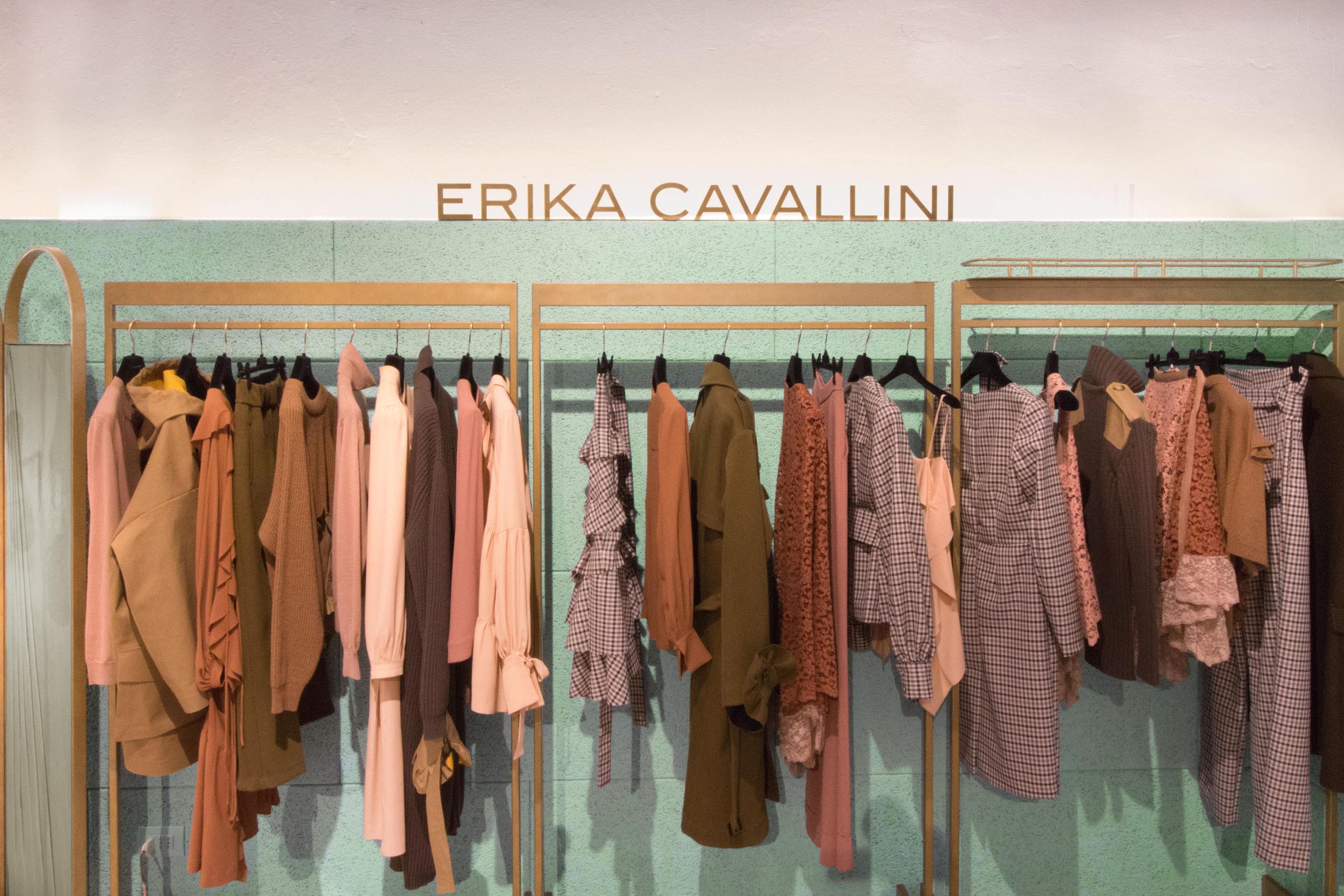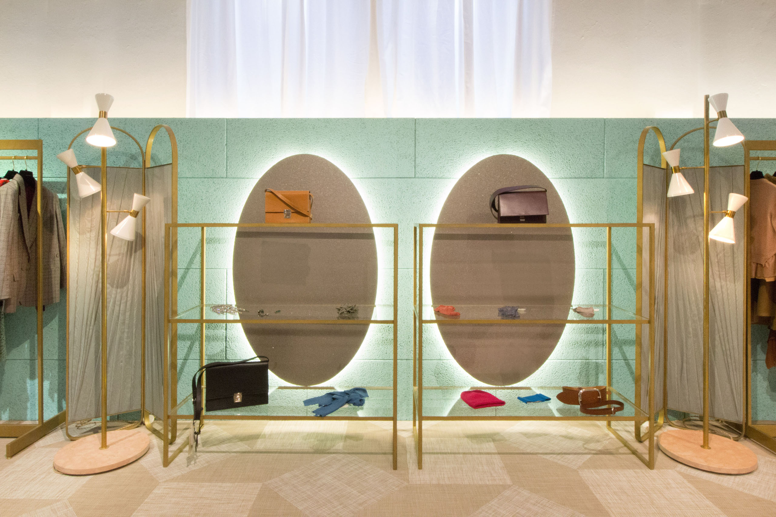 The showroom is developed in a single room with the collections displayed along the perimeter in freestanding metal elements with antique brass finish.
