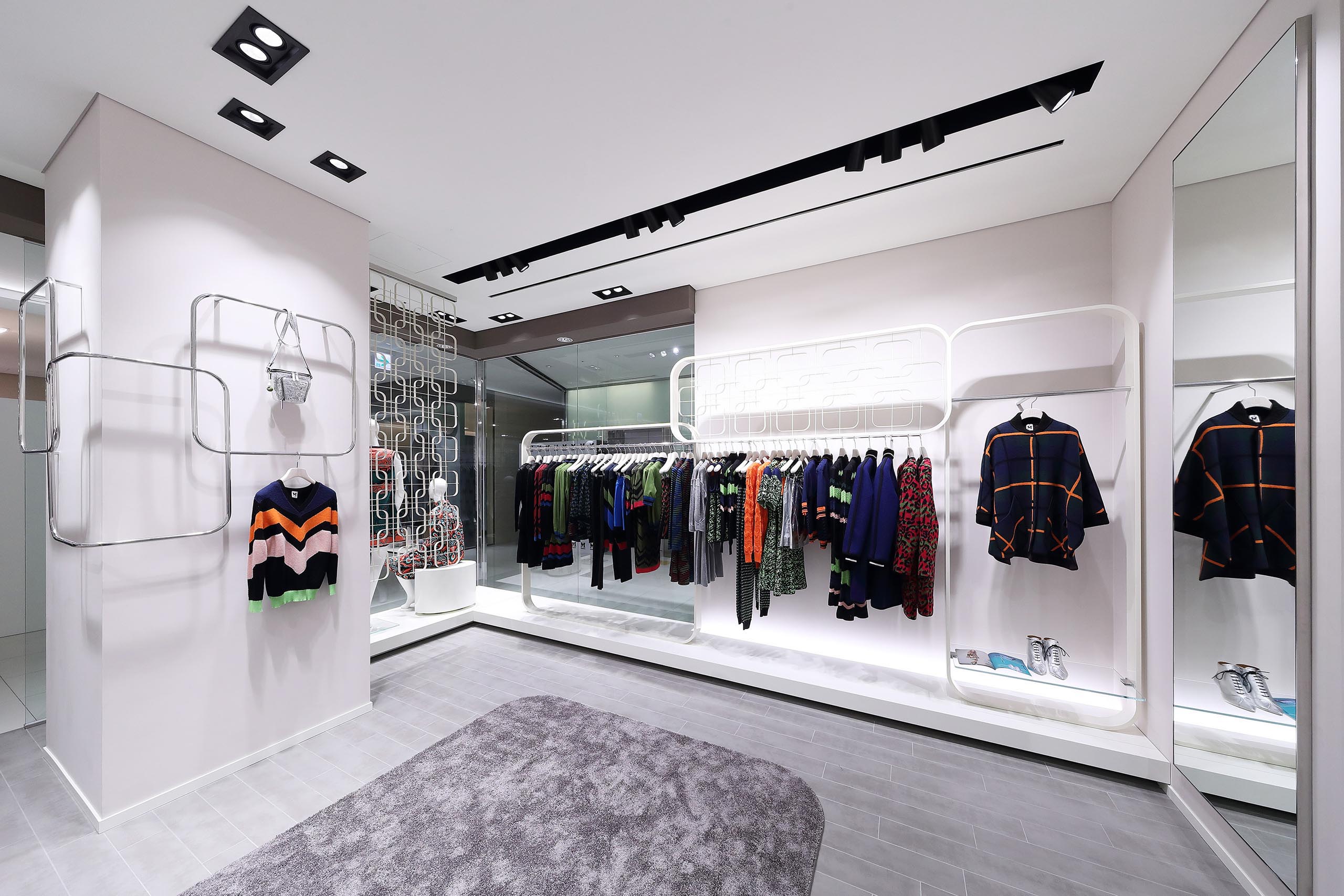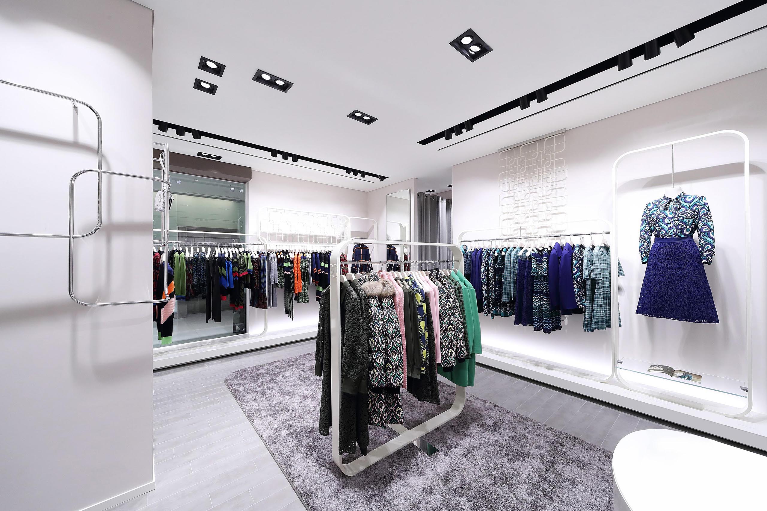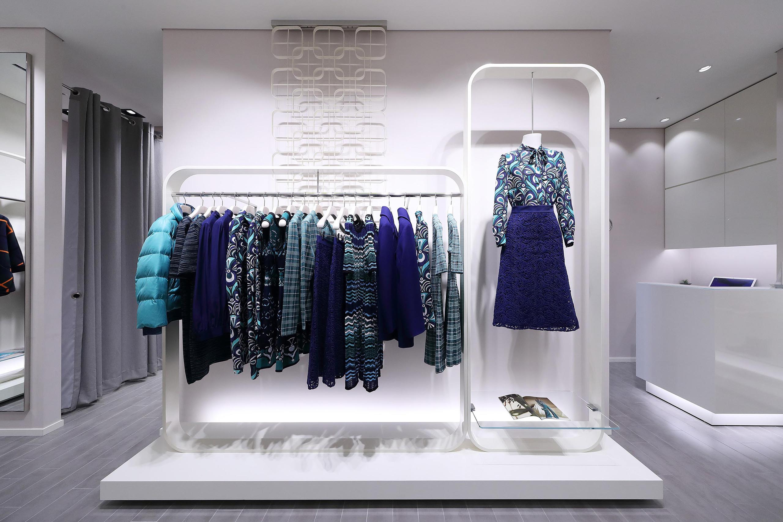 The shop’s cipria pink colored walls are enhanced by bright white lacquered tables, pedestals, and rectangular white-painted aluminum display frames with rounded edges and different heights and proportions.